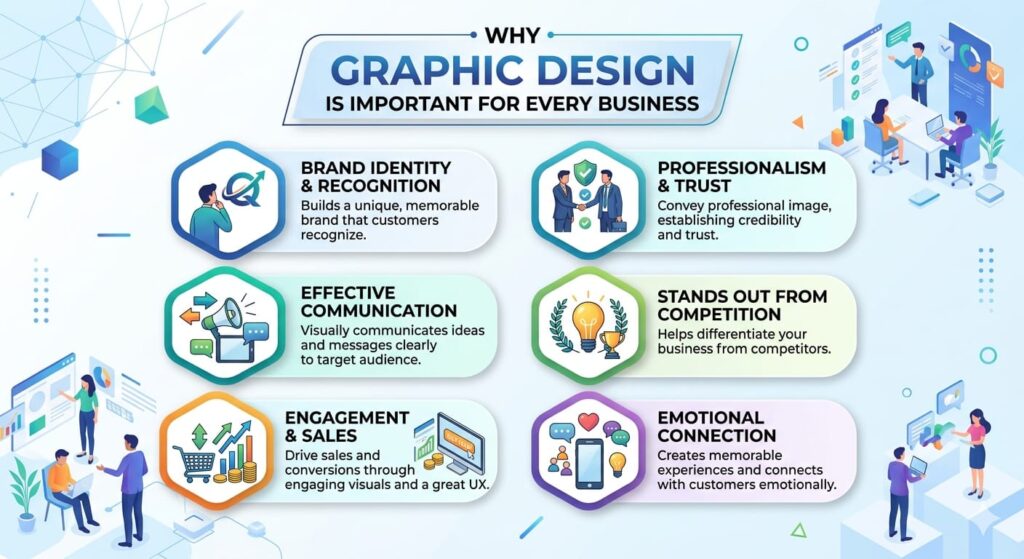 Graphic design plays a crucial role in how a business communicates with its audience. In today’s competitive market, visual content is often the first thing people notice about a brand. Professional graphic design helps businesses create a strong and memorable identity through logos, advertisements, social media posts, websites, and marketing materials. It not only makes a brand look attractive but also builds trust and credibility among customers. By using creative visuals and effective design strategies, businesses can communicate their message clearly, attract more attention, and stand out from competitors.